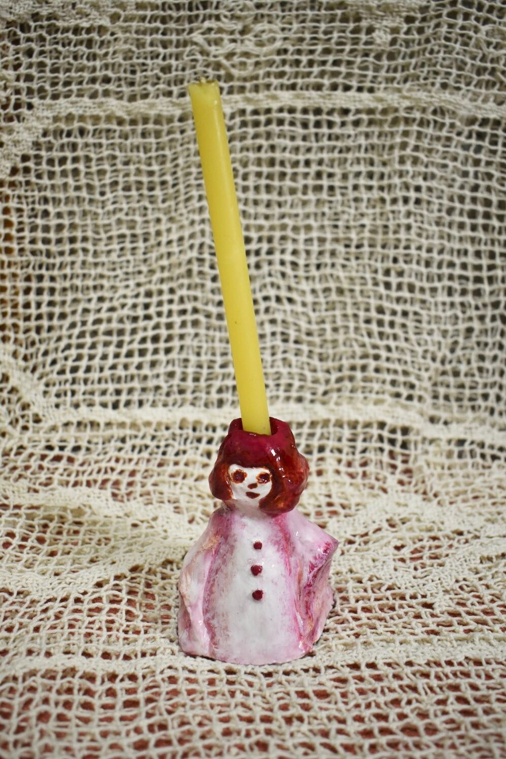 ・こちらの作品は陶器ではない為、ホルダー口に火が直接当たる状態が続くとその周辺が黒く焦げる又は異臭を放つことがございます。蝋燭が短くなり、ホルダー口や粘土部分に近づいてきた時点で必ずお取り換えをお願いいたします。